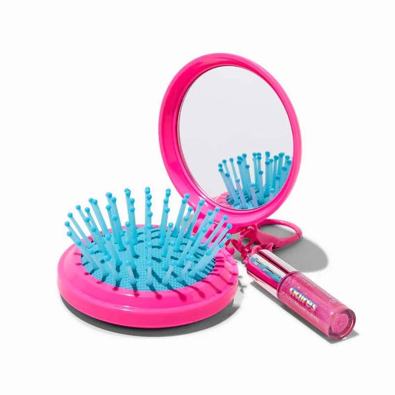 Cepillo para el cabello compacto con espejo en color rosado con inicial K incluye llavero y lip gloss