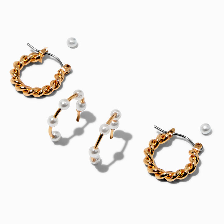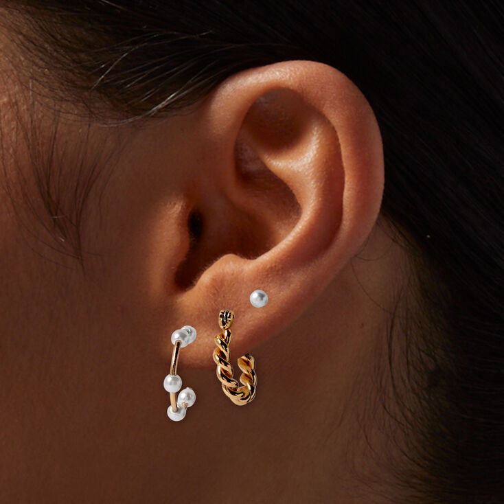Set de aretes en tono dorado entorchado con detalle de perlas