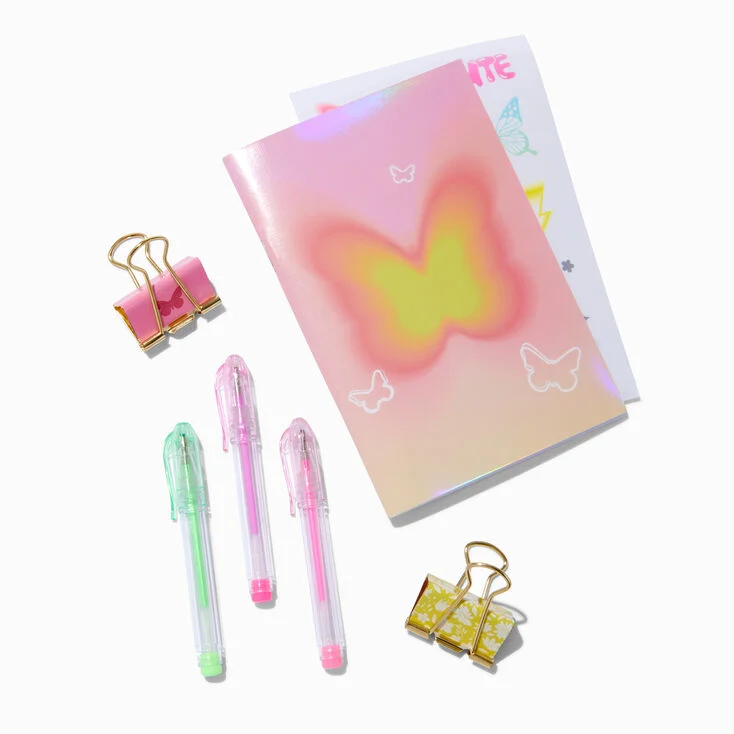 Set de libreta y accesorios con diseño de mariposas. Incluye: 3 lapiceros, 2 clips, 1 libreta 1 estuche