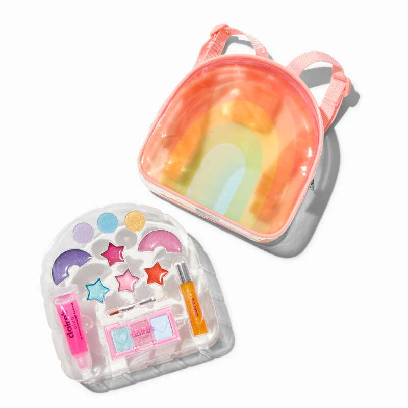 Set de maquillaje – Claire’s Club diseño de arcoíris. Incluye: 3 sombras individuales, 1paleta triple de sombras, 2 gloss, 6 gloss individuales y 1 aplicador dúo